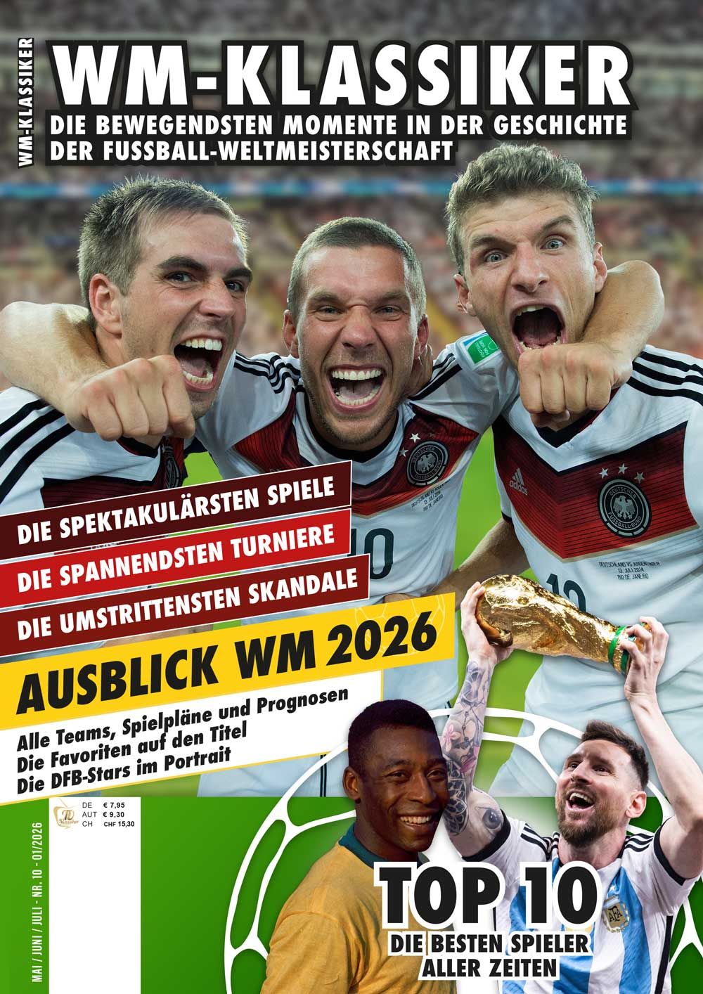 Auf 84 aufwendig gestalteten Seiten nehmen wir die Leser mit auf eine Reise durch die größten Momente der WM-Geschichte: legendäre Spiele, unvergessliche Tore und prägende Persönlichkeiten des Weltfußballs. Gleichzeitig werfen wir einen fundierten Blick auf das bevorstehende Turnier 2026 und stimmen die Leser sechs Wochen vor dem Anpfiff auf das größte Fußballereignis der Welt ein.