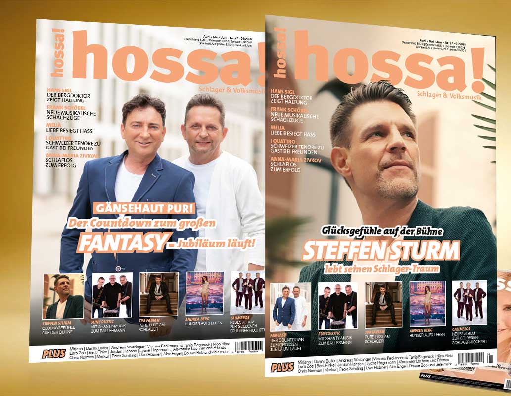 Der Schlager hat viele Gesichter! Und um möglichst viele davon abbilden und in Szene setzen zu können, haben wir uns für ein Wendecover entschieden – wie bereits bei der vergangenen hossa!-Ausgabe. Während Steffen Sturm für Glücksgefühle auf der Bühne und im Publikum sorgt, steuern Fantasy langsam aber sicher auf ein großes Jubiläum im nächsten Jahr zu. 30 Jahre Fantasy: Das soll natürlich gebührend gefeiert werden. Doch bis es soweit ist, halten Fredi und Martin noch ein paar weitere Trümpfe in der Hand.