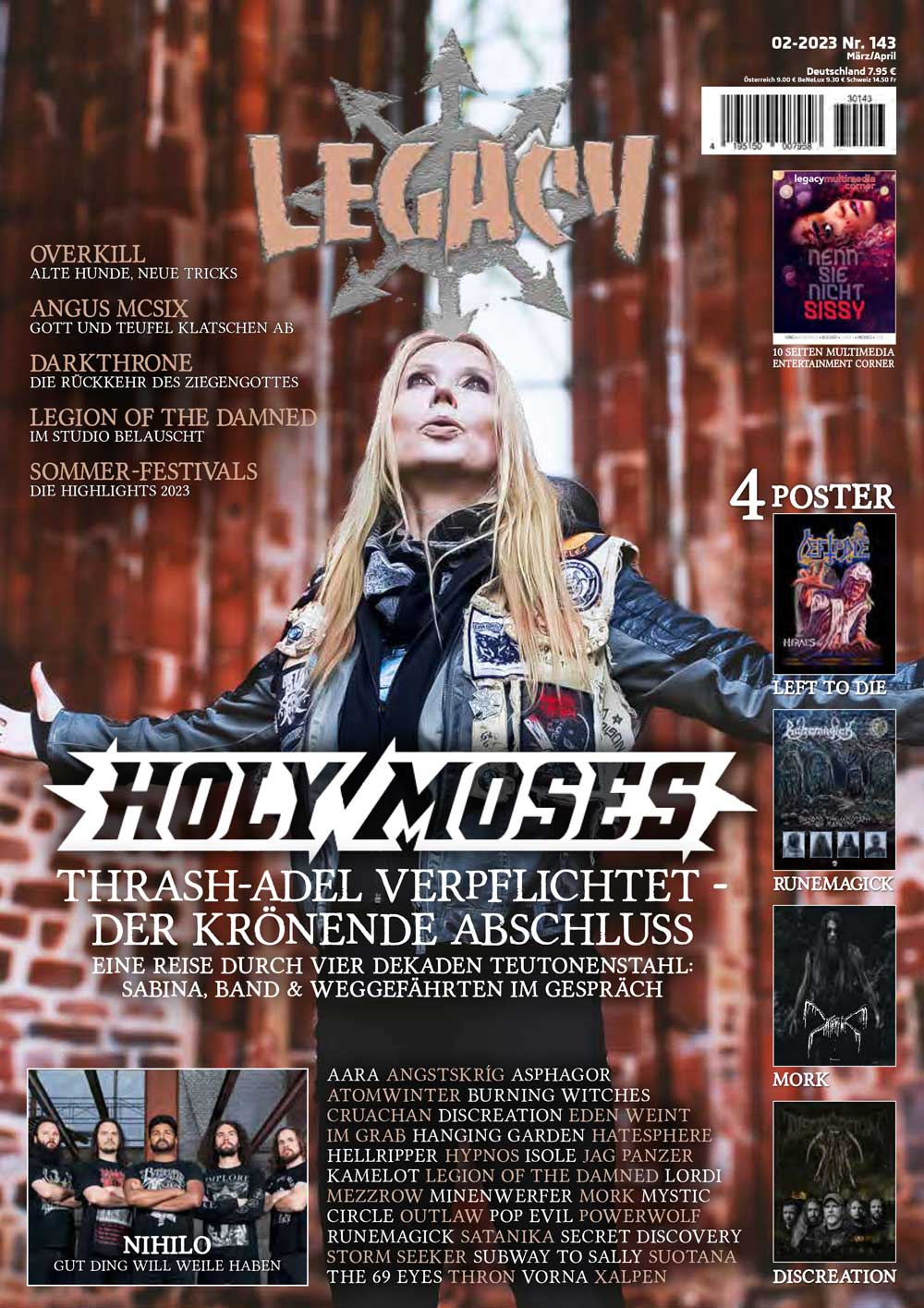 Holy Moses & dedication to the underground: For over 40 years, Holy Moses have created music and infected – especially in the 80s and 90s – thousands of metalheads with the Thrash Metal virus. Now, the queen and her loyal men want to give over the scepter with their final album, “Invisible Queen”, and end their career. But who will be able to fulfill their task with the same passion and talent? On eight full pages we talk with Sabina (who was everything, but never invisible) and her band, we invited old friends for a statement and we analyze the Holy Moses discography. Having real cult Metal as our title story demands from us to continue shining light on quality steel from the underground. Thus, as a co-title story, we lured our Swiss friends from Nihilo in – whose musical class goes without saying – to talk with us about their 20th birthday. These metalheads prove time and again what’s possible and what talent lies in the metal underground.