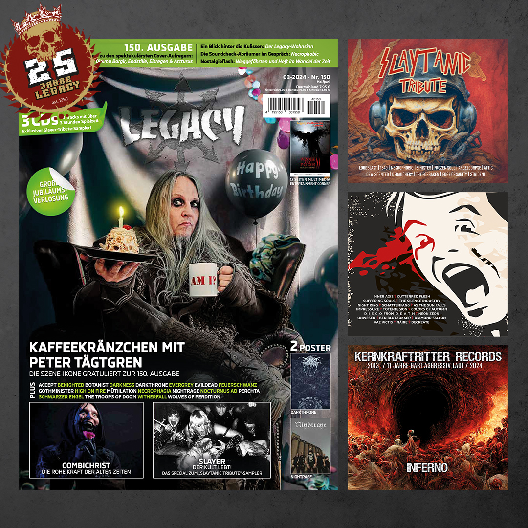 But that’s not all: This issue includes three full-length CD supplements. Alongside the usual 18-track Legacy sampler, our friends at Kernkraftritter have contributed a sleek compilation of 17 songs, introducing powerful underground bands. Moreover, celebrating the 150th issue wouldn’t be complete without paying tribute to Slayer, who arguably invented Extreme Metal. As the band members are typically reticent, we’ve done something different: the “Slaytanic Tribute” compilation CD features twelve bands covering a Slayer song in their own style, accompanied by interviews in the magazine.
